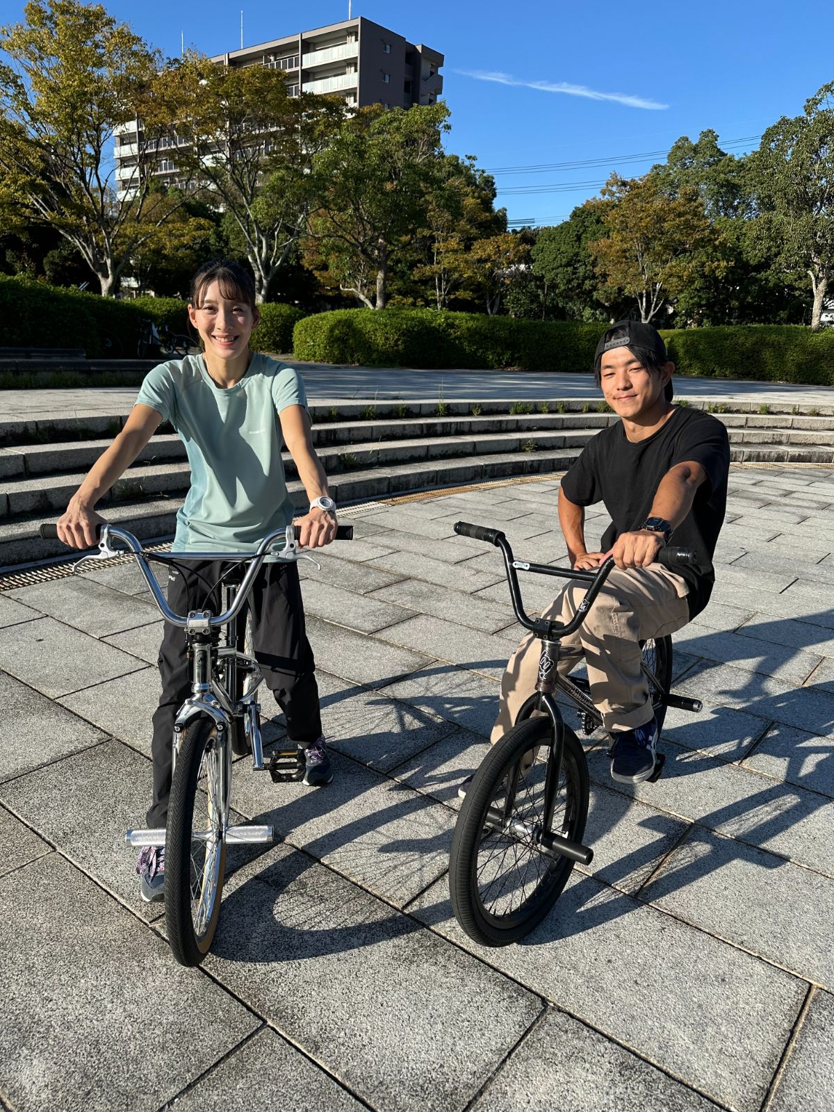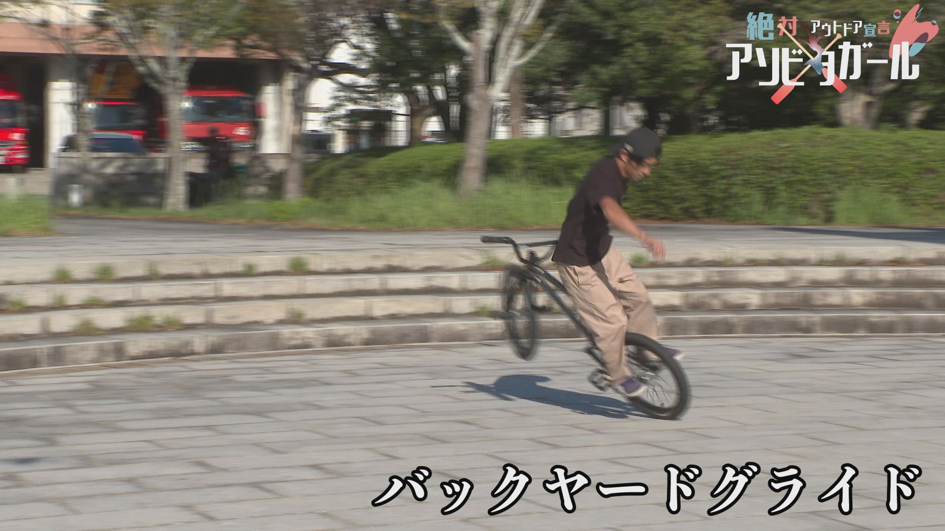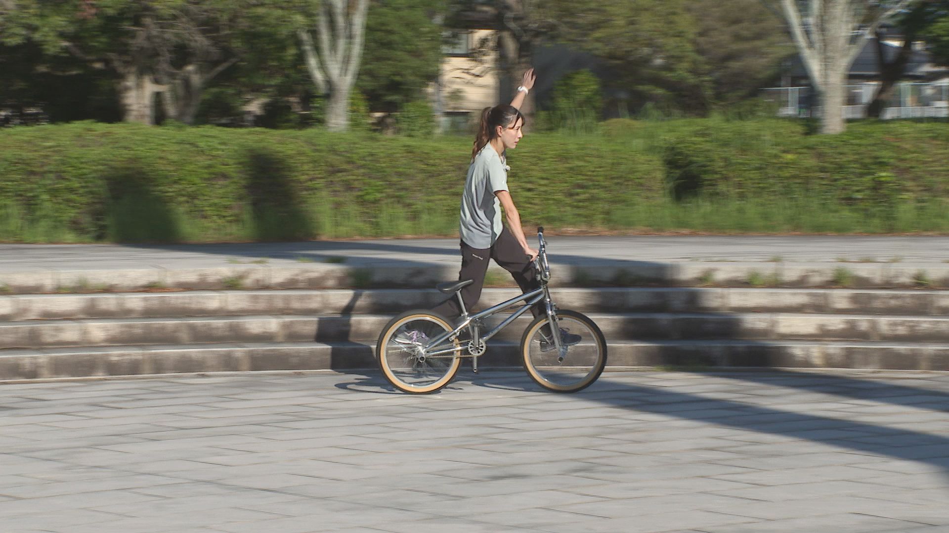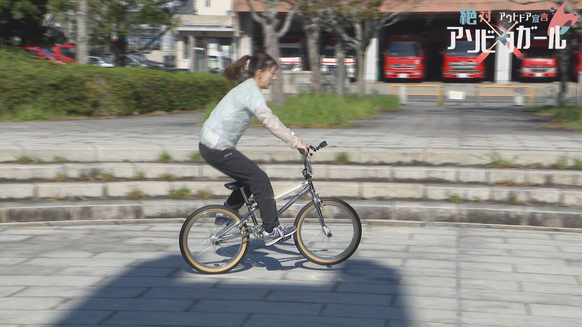 りさちゃん人生初のBMXフラットランドのトリックは「フロントアップ」ペグに両足をのせて「リアアップ」など連続でトリックを決めていきます。左手をしっかり伸ばした大技!「ワンハンドバランス」も決まりました。