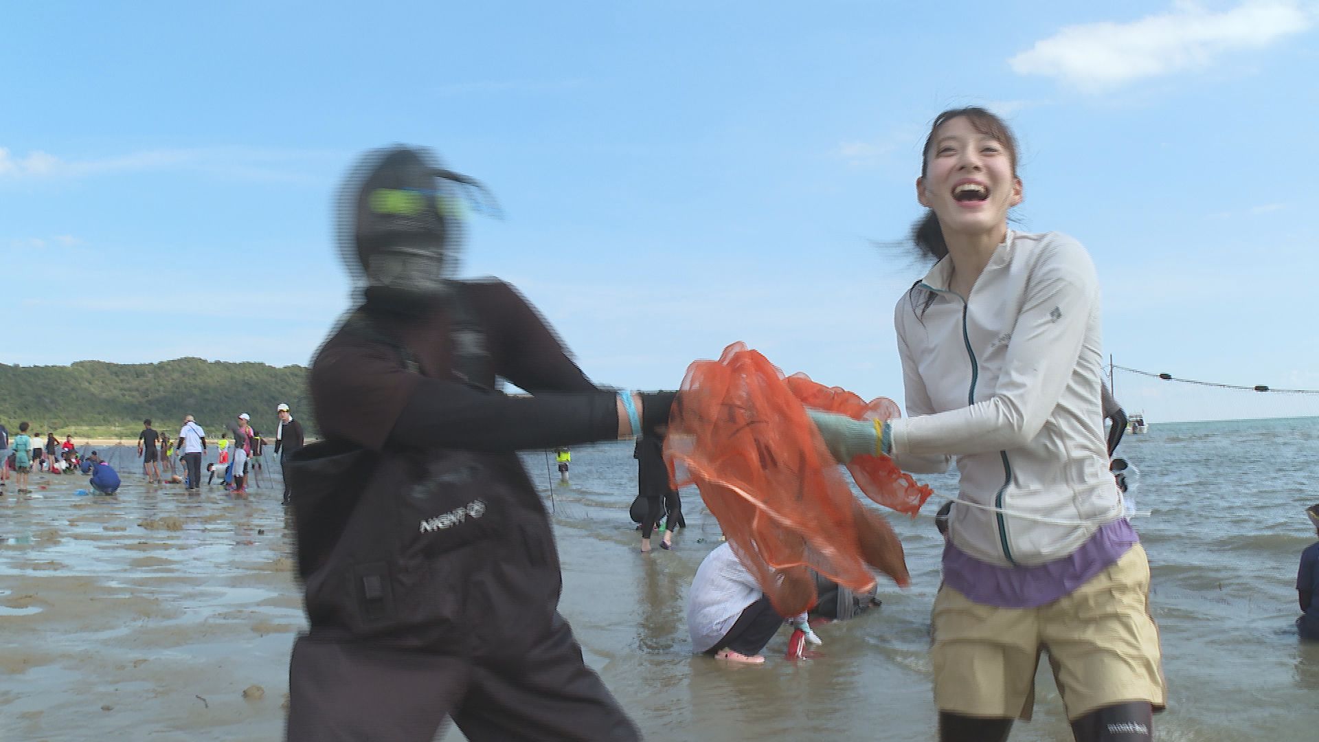 競技開始からクルマエビを捕まえる大田理裟さん。クライミングで鍛えた指を熊手のように砂を掘り、大量のクルマエビをゲットします。