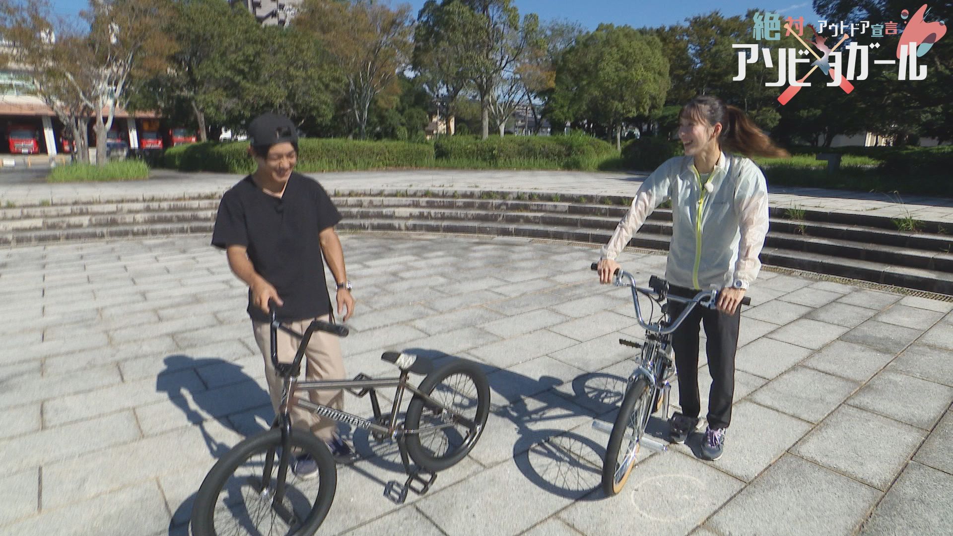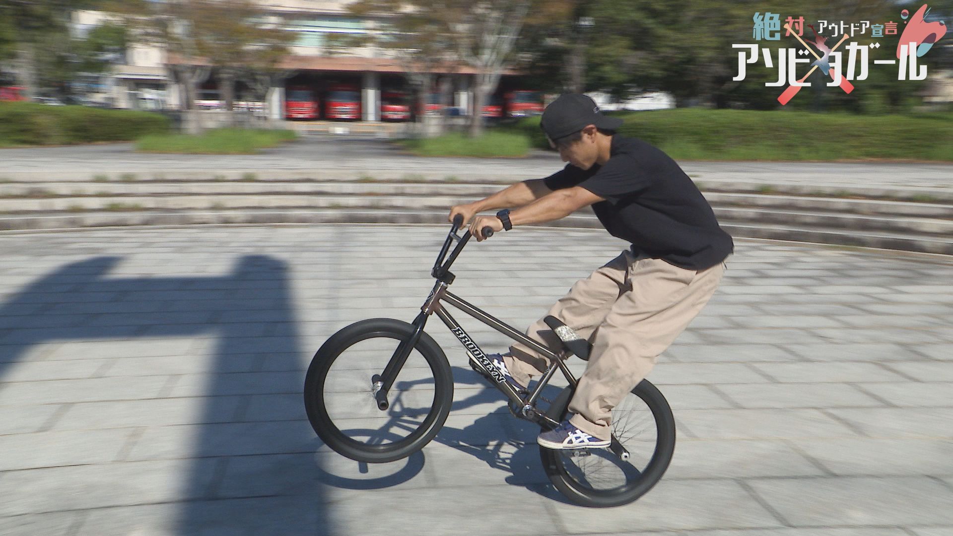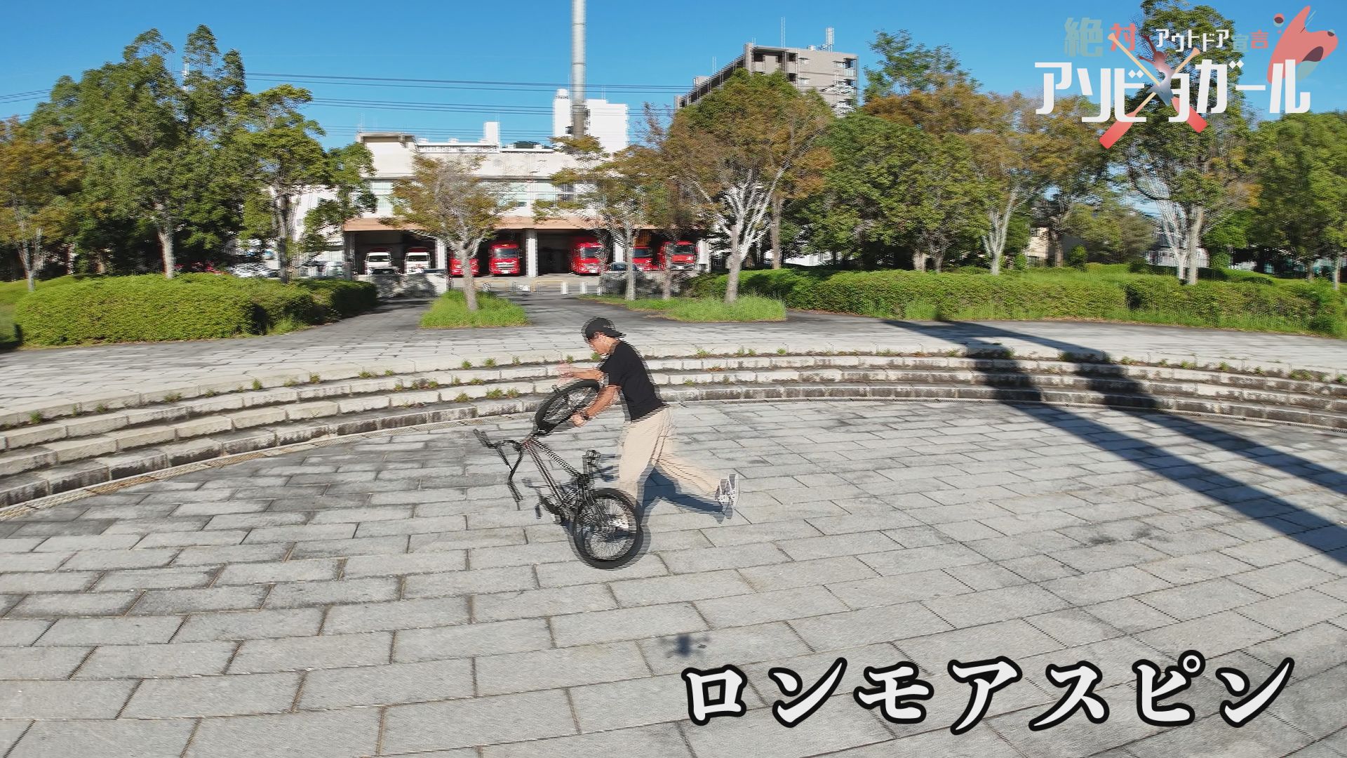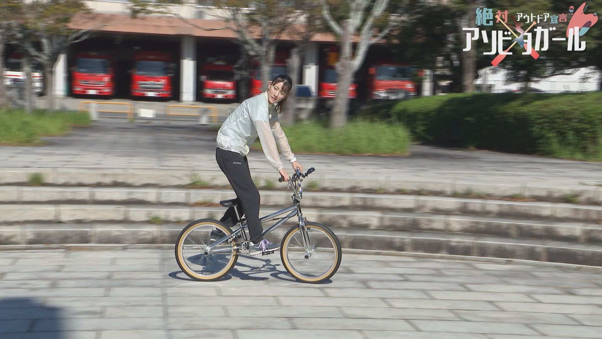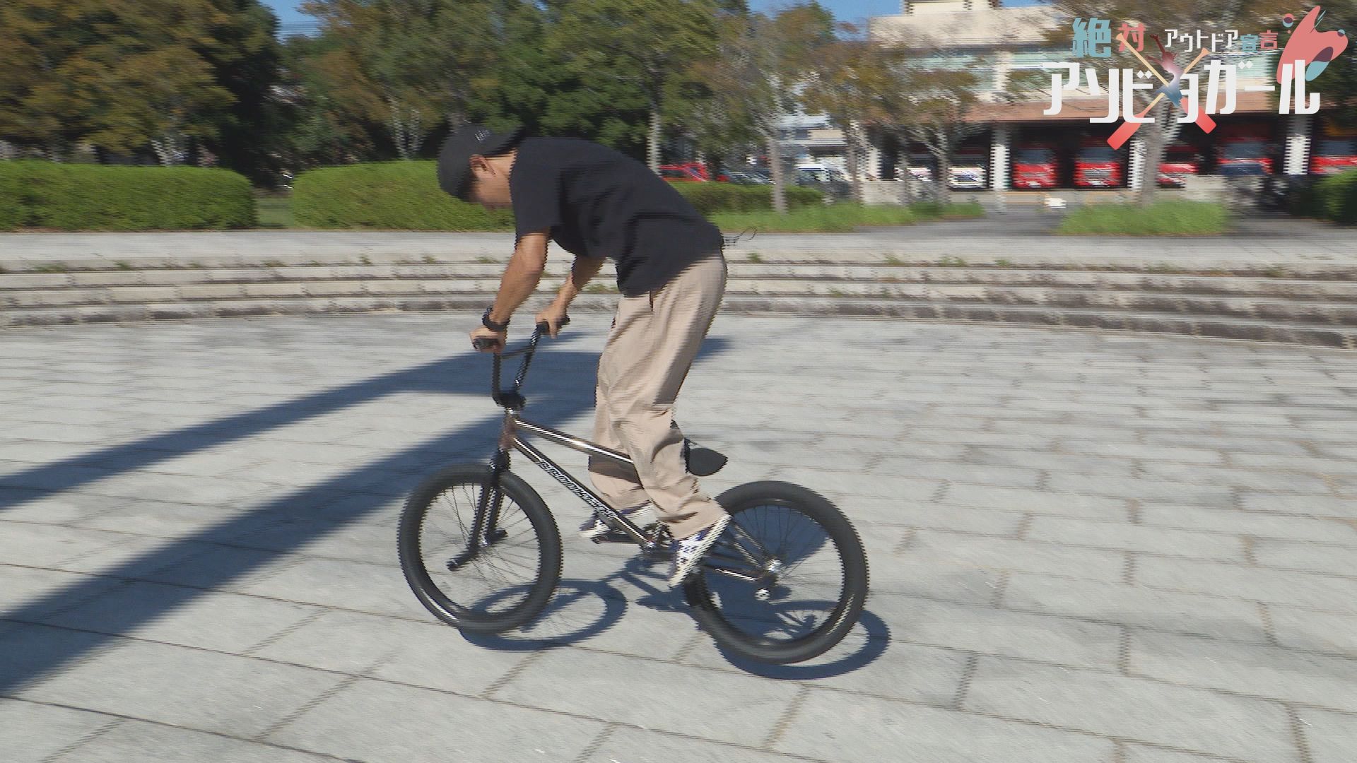 りさちゃん人生初のBMXフラットランドのトリックは「フロントアップ」ペグに両足をのせて「リアアップ」など連続でトリックを決めていきます。左手をしっかり伸ばした大技!「ワンハンドバランス」も決まりました。