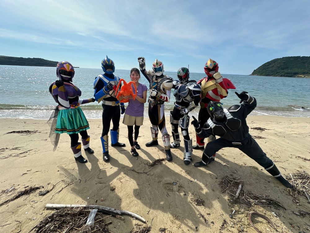 今回は山口市秋穂東中道海水浴場多田ビーチで行われた「第33回あいおえび狩り世界選手権大会」にアソビタヒーロー達が出場しました。出場選手はプロフリークライマー/アソビタガール 大田理裟・清流光神ハクジャオー・海峡戦士タイガーフーク・音楽戦士ビート・アントシェード