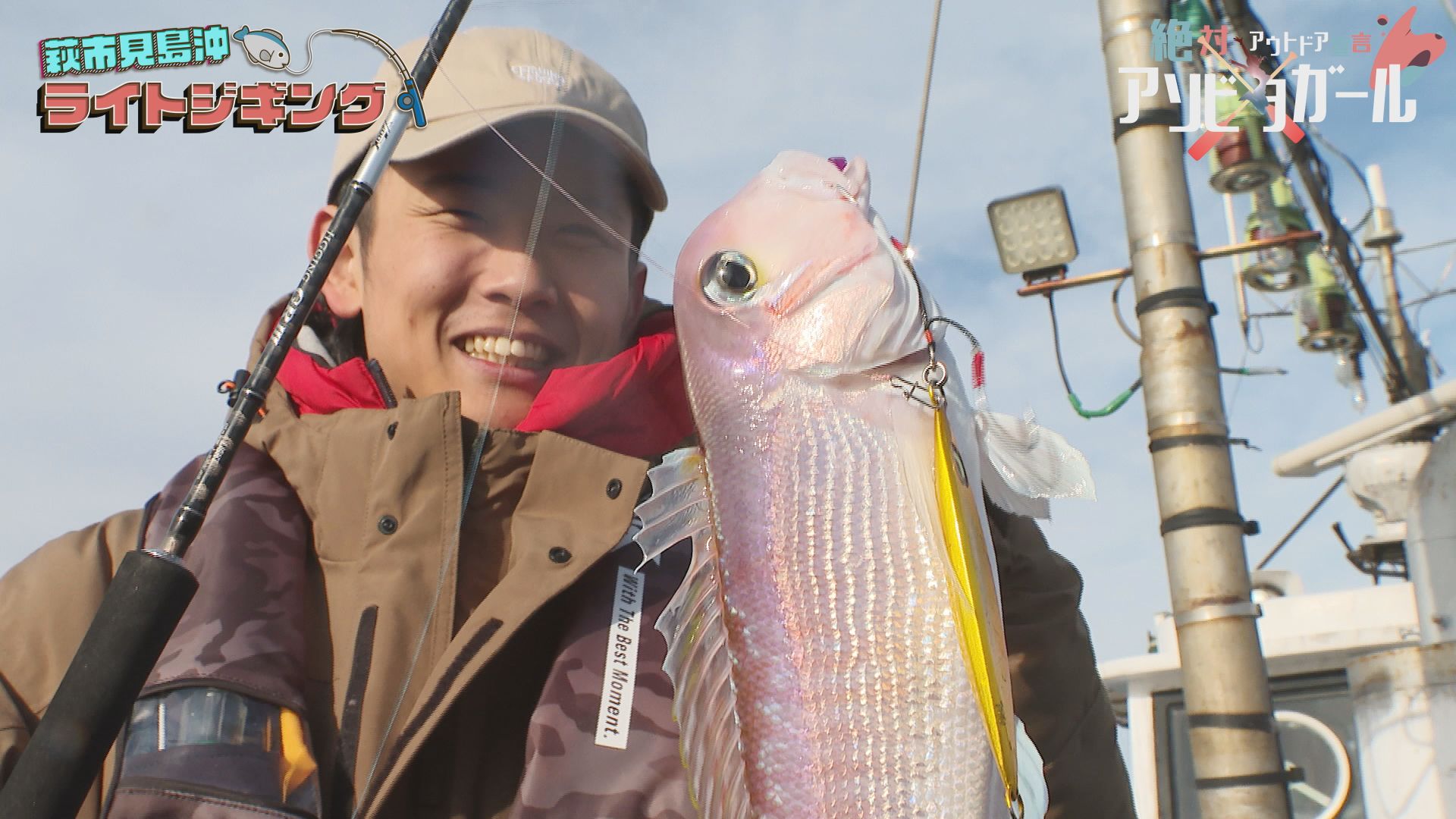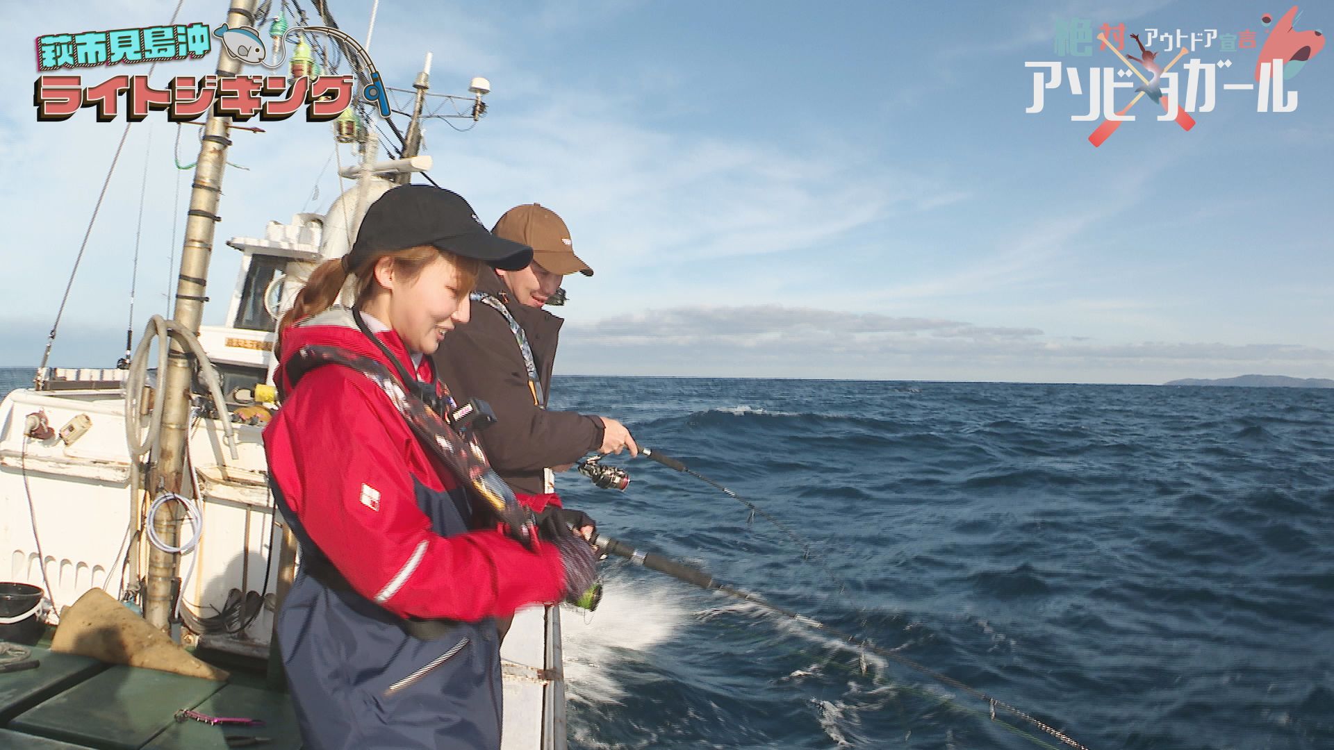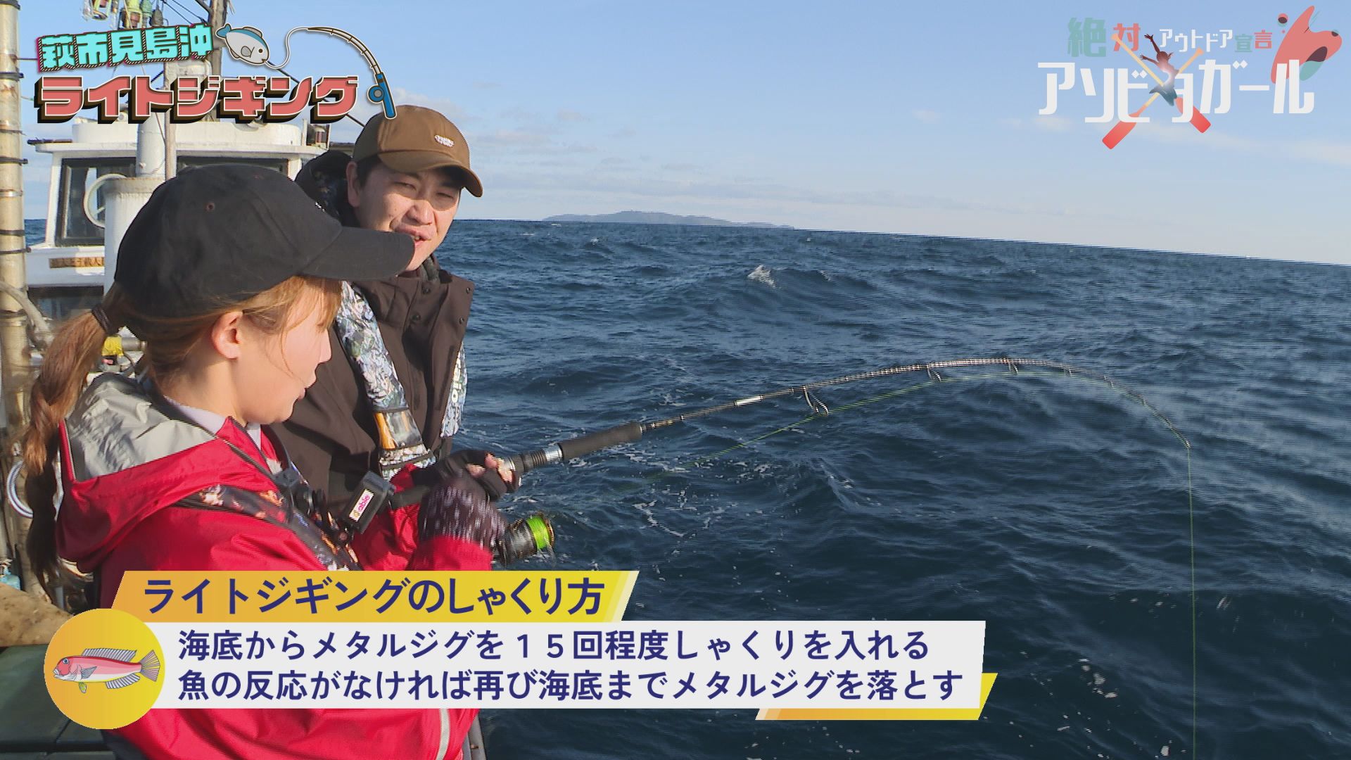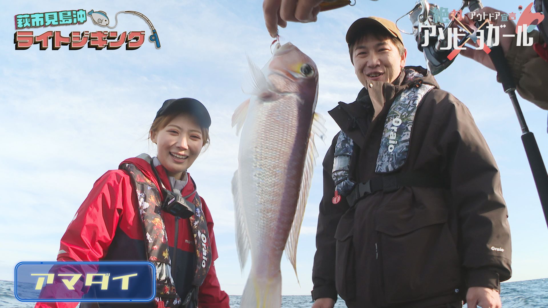 アソビタガール2号の兼頭のぞみが初めての船で海釣りに挑戦します。釣りの先生は釣具のポイント山口小郡店の近藤店長です。今回はライトジギングで水深100mの海底にいるマダイや根魚、高級魚のアマダイを100~120gのメタルジグを使って釣ります。