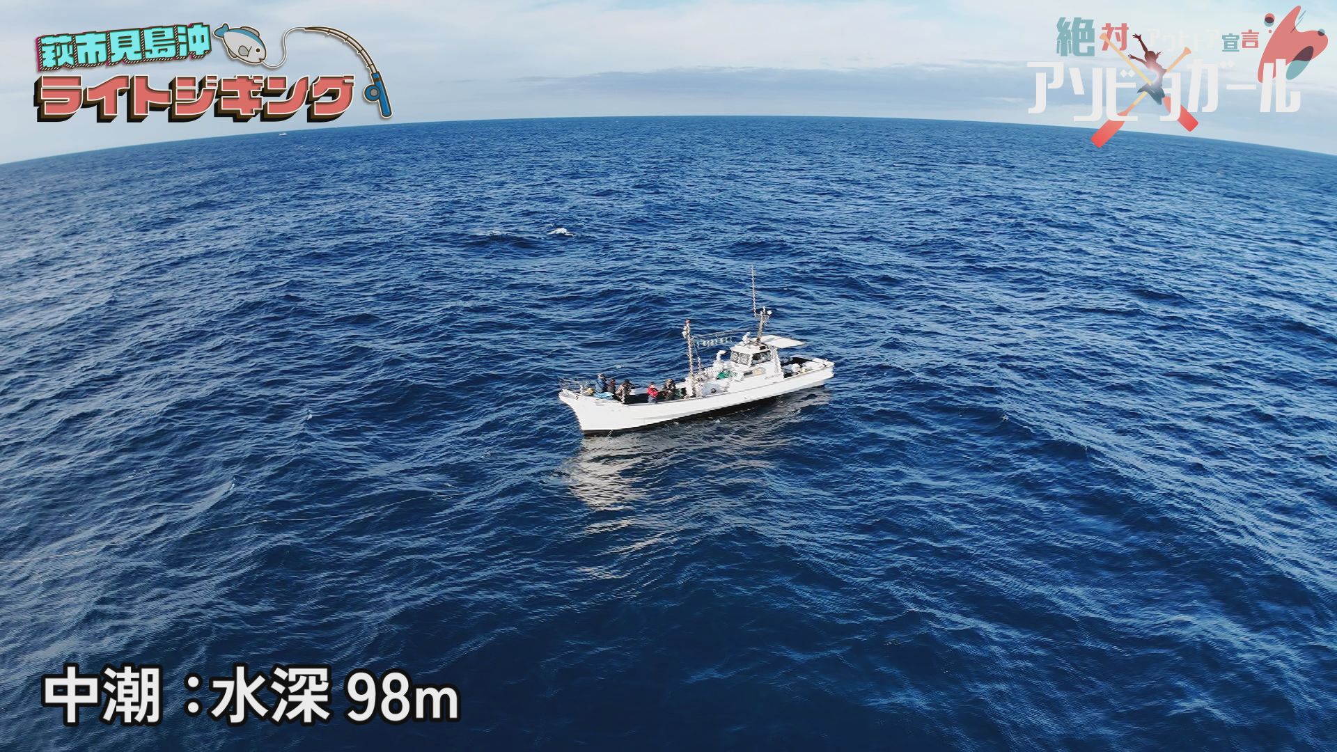 萩市見島沖の翔陽丸でライトジギング。パラシュートで船を流しながら海底に潜むターゲットを狙います。海底までメタルジグを着底させて、ハンドル半回転程度のワンピッチジャークで約15回シャクリを入れます。魚のアタリがあれば合わせて釣りあげます。