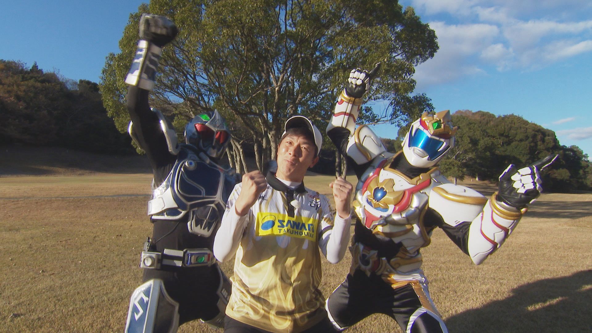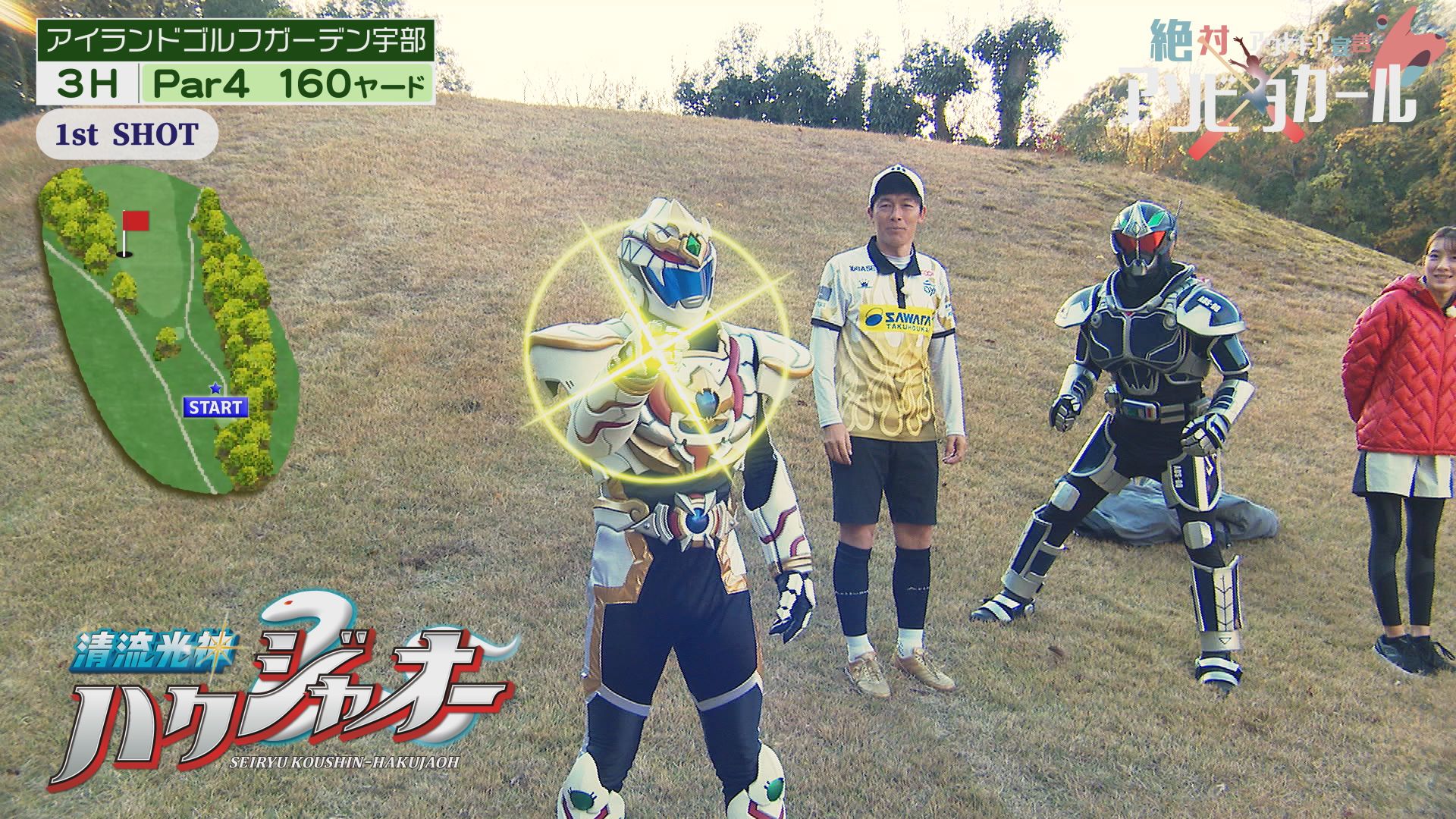 フットゴルフ日本代表の安村翼さんとハクジャオーとアオダイショーのヒーローチーム。