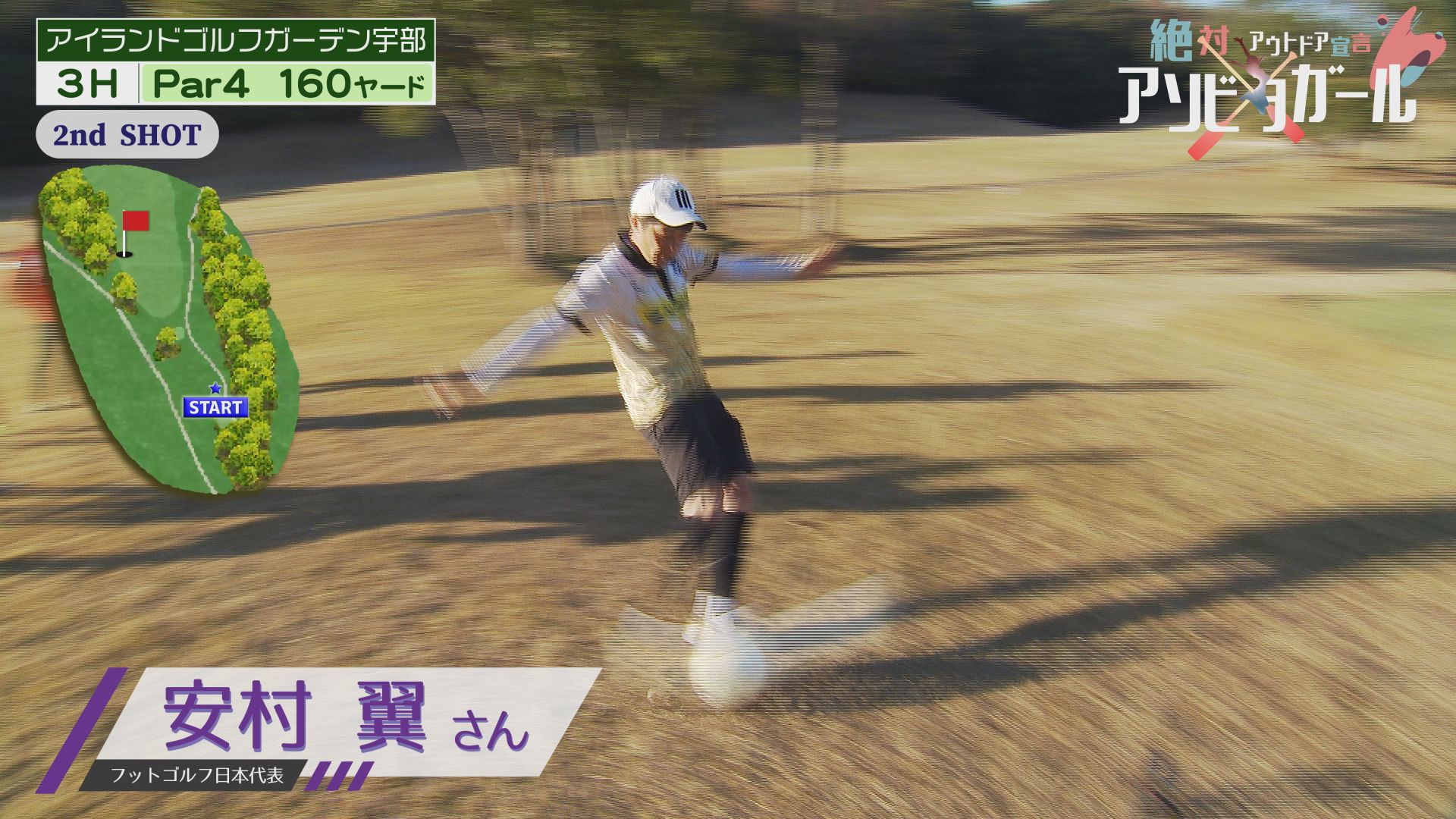 負けじとヒーローチームのセカンドショットはフットゴルフ日本代表の安村さん!