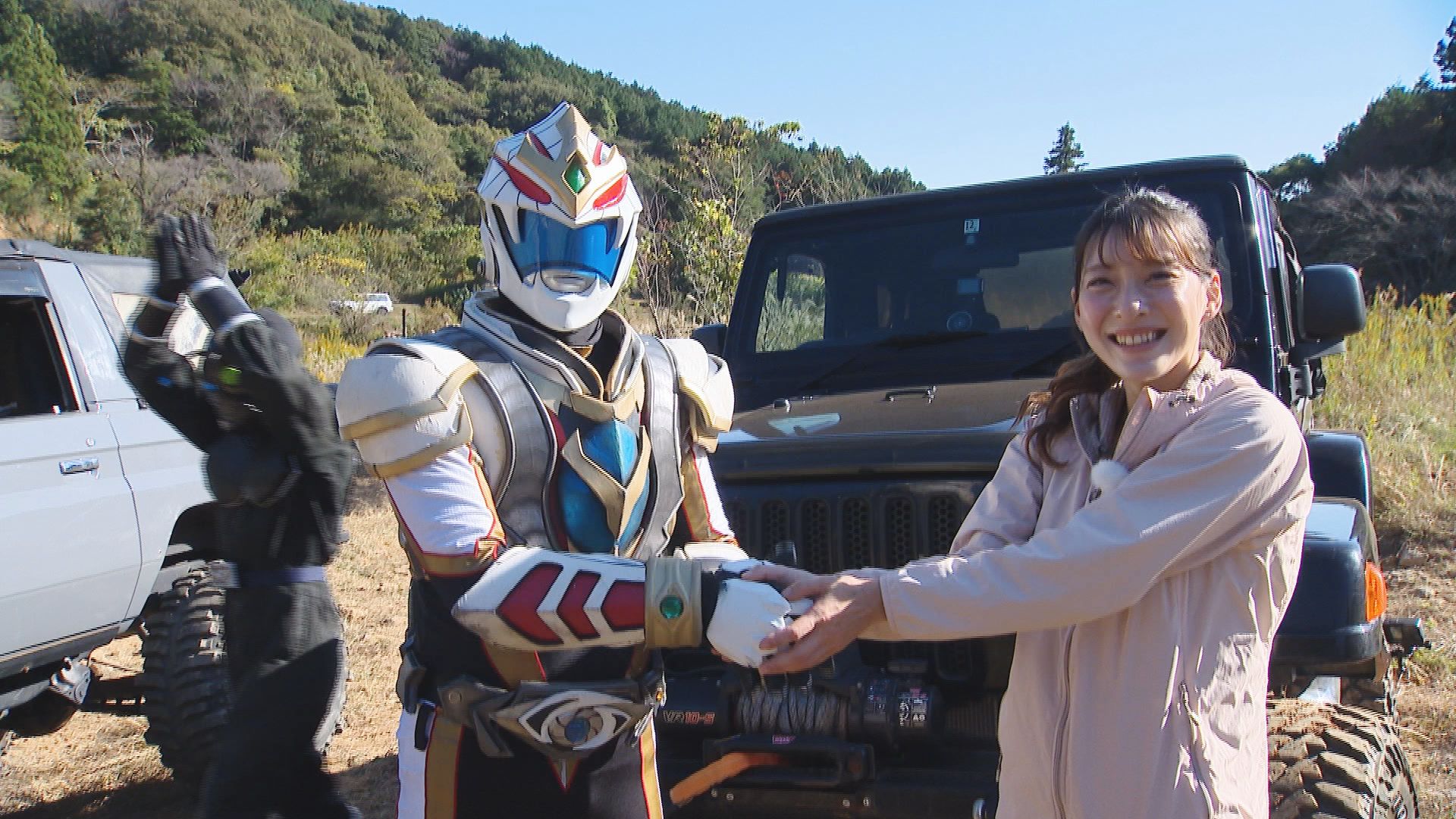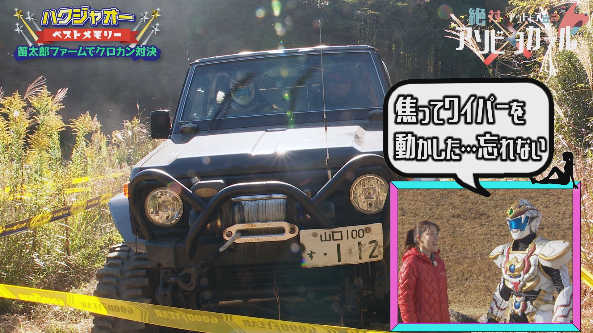 ハクジャオーの運転するランクル70はマニュアル車で、ギア変速に苦労をしながらのレースでした。レース中は焦ってワイパーを動かすハプニングがありましたが、ヒーローらしく安全運転で四駆を運転していました。