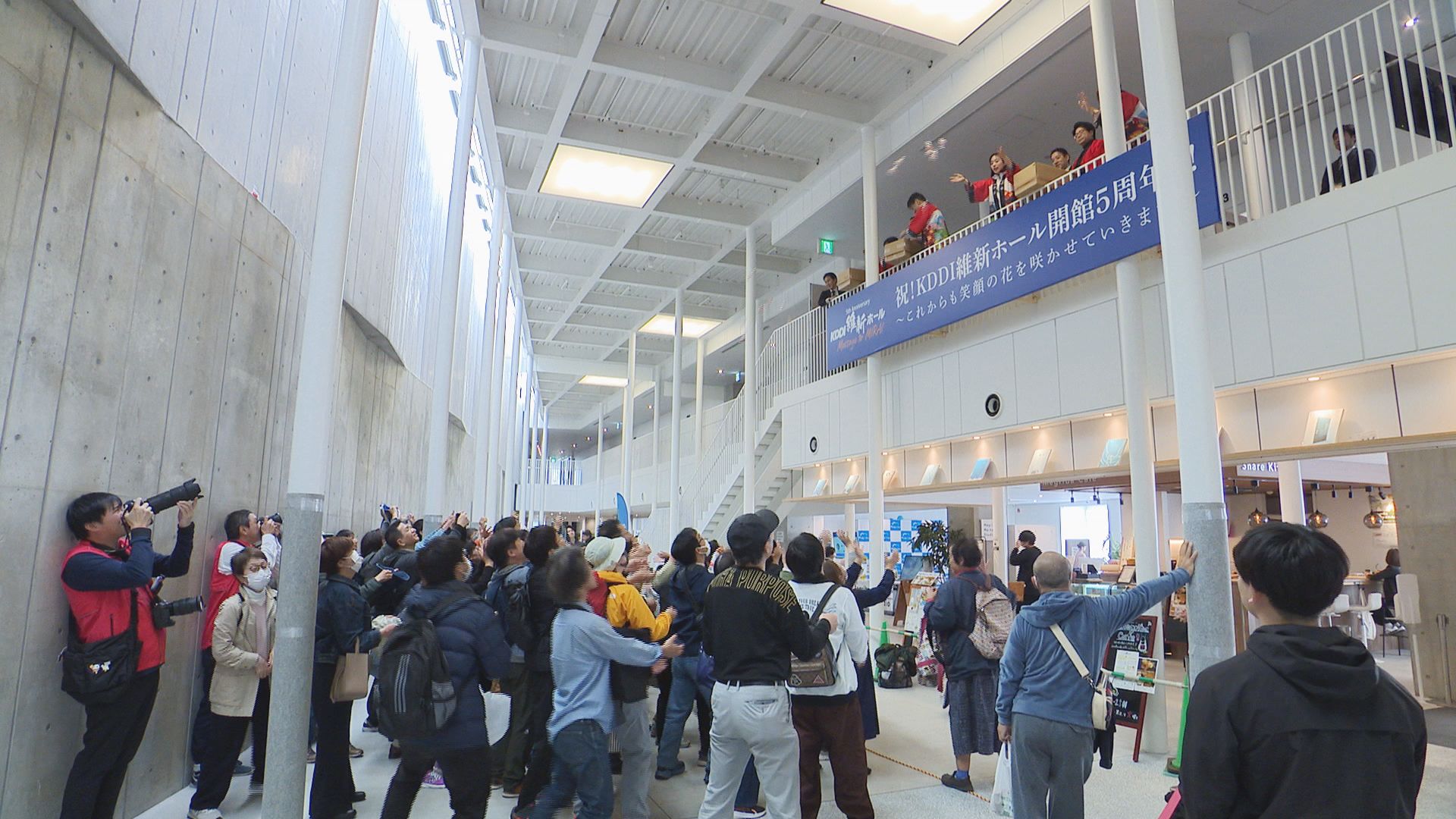 KDDI維新ホール5周年を記念して、山口市の伊藤和貴市長と卓球元日本代表の石川佳純さんの記念餅まきが開催されました。1500個の餅の袋が次々と投げられると、子どもたちが歓声を上げながらつかんだり、拾ったりと会場はお祝いムードに包まれました。
